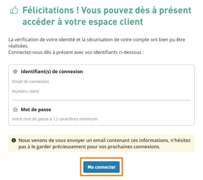 Etape 6 : Le récapitulatif de vos informations de connexion s’affiche. Votre identité est vérifiée et votre compte est sécurisé.