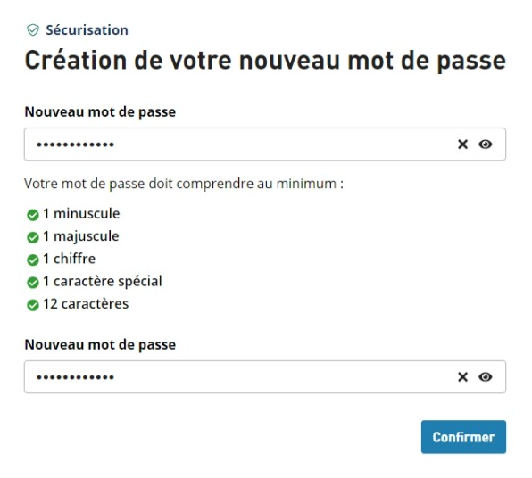 Au minimum 12 caractères dont : 1 minuscule + 1 majuscule + 1 chiffre + 1 caractère spécial